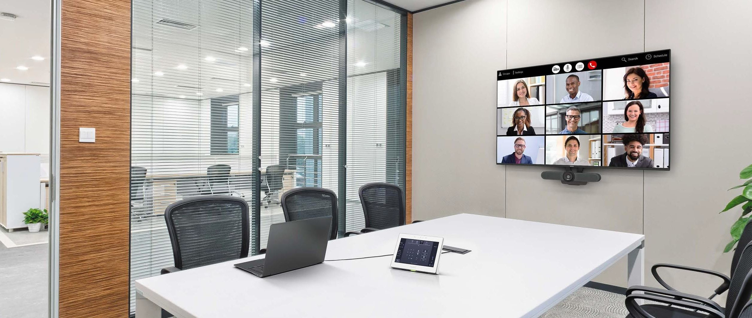 Ruang rapat modern dengan teknologi interaktif, kamera pintar, dan sistem kolaborasi nirkabel untuk meningkatkan produktivitas dan komunikasi tim.